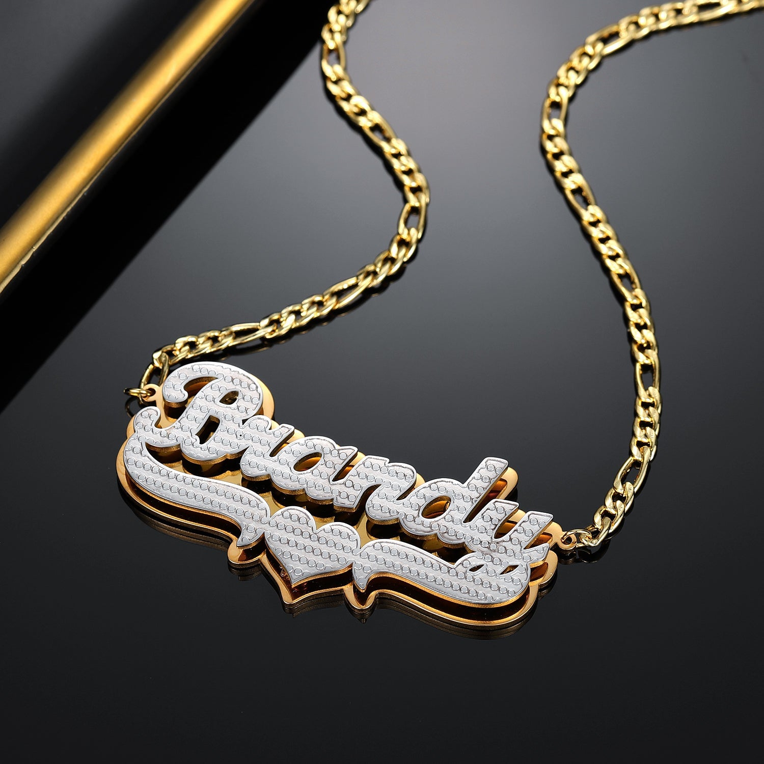 Make a statement with our new double plated collection! Personalize this figaro chain with your name, the name of a loved one, or a special word. Crafted from 18K gold and silver plating, this piece is made to last.